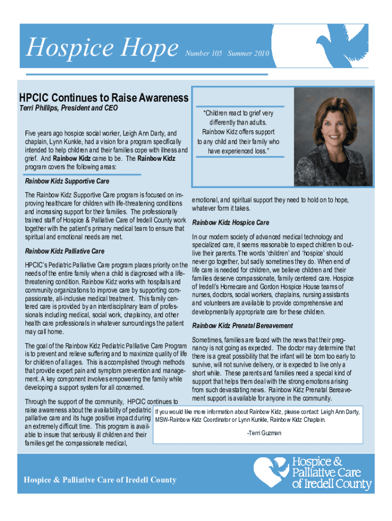 Hospice Outnumber 105 Summer 2010HPCIC Continues to Raise Awareness Terri Phillips, President and Five years ago hospice social worker, Leigh Ann Party, and chaplain, Lynn Uncle, had a vision for