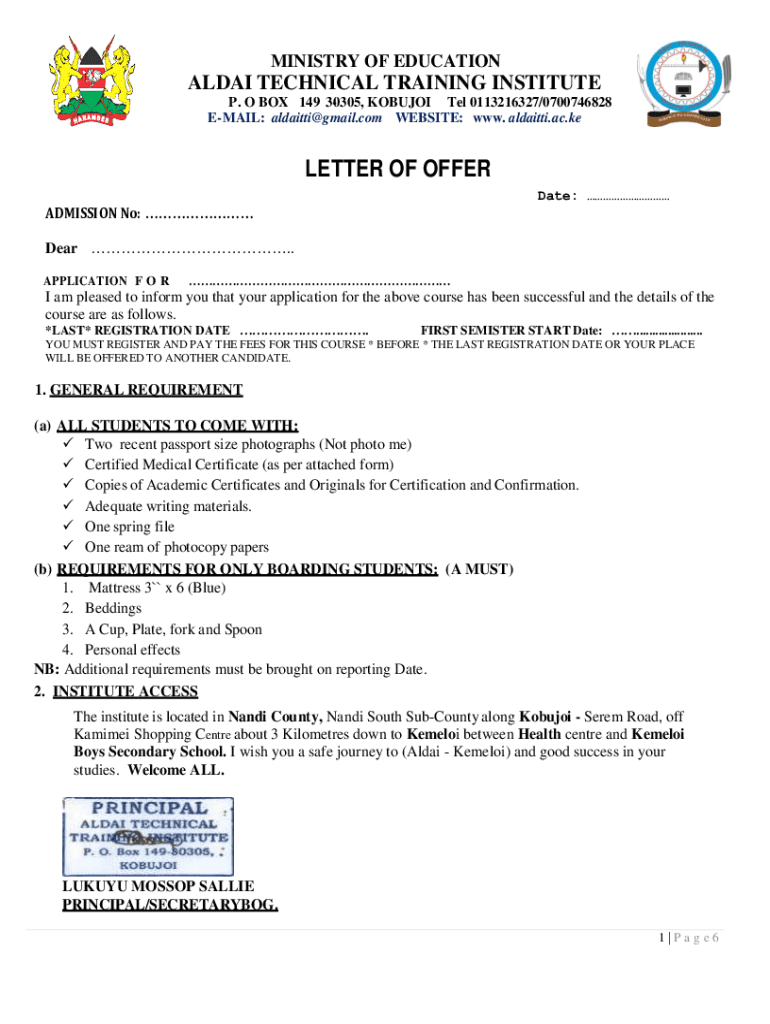 MINISTRY OF EDUCATIONAL DAI TECHNICAL TRAINING INSTITUTE P. O BOX 149 30305, KABUKI Tel 0113216327/0700746828 E MAIL: aldaitti@gmail.com WEBSITE: WWW. Andretti.ac.letter OF OFFER Date: ADMISSION No: