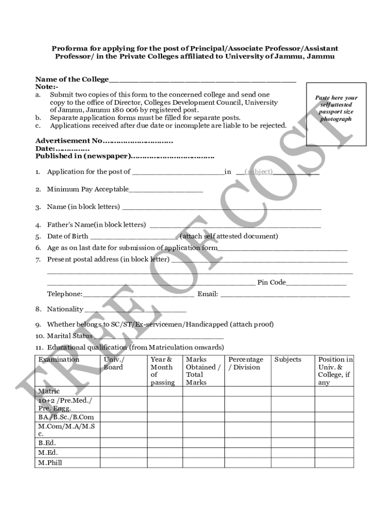 Proforma for applying for the post of Principal/Associate Professor/Assistant Professor/ in the Private Colleges affiliated to University of Jammy, Jammy Name of the College___ Note:a. Submit two