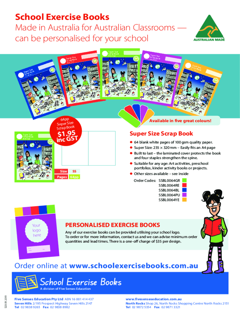 School Exercise Books Made in Australia for Australian Classrooms can be personalized for your school64pp Super Size Scrap Book$1.95Tinc GSSizeSSPages 64ppYour logo bioavailable in five great colors!