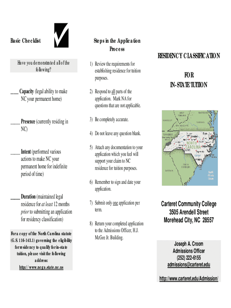 Basic Checklist Have you demonstrated all the following?___ Capacity (legal ability to make NC your permanent home)___ Presence (currently residing in NC)___ Intent (performed various actions to make