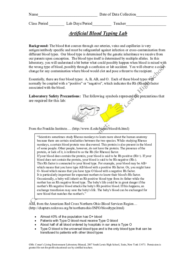 Name___ Date of Data Collection___ Class Period ___ Lab Days/Period___ Teacher___Artificial Blood Typing Lab Background: The blood that courses through our arteries, veins and capillaries is very