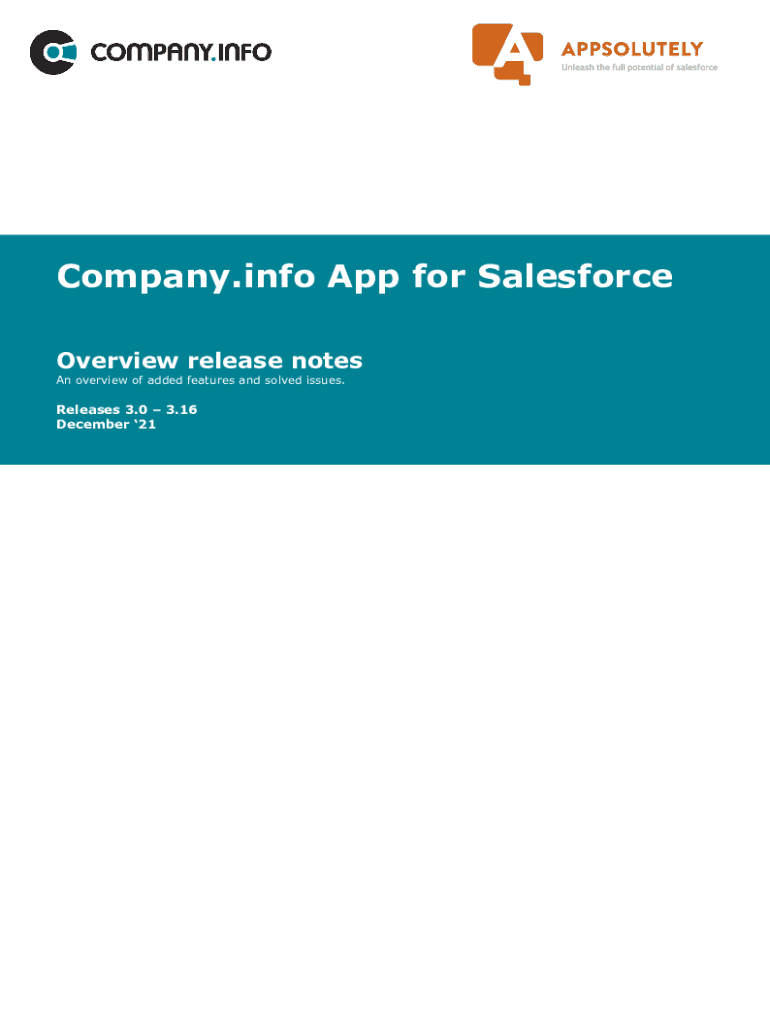 Company.info App for Salesforce Overview release notes An overview of added features and solved issues. Releases 3.0 3.16 December 21Table of Contents1. Intro32. Release Notes42.1 Version 3.842.2