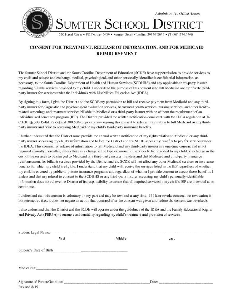 CONSENT FOR TREATMENT, RELEASE OF INFORMATION, AND FOR MEDICAID Reimbursement Sumter School District and the South Carolina Department of Education (SIDE) have my permission to provide services to