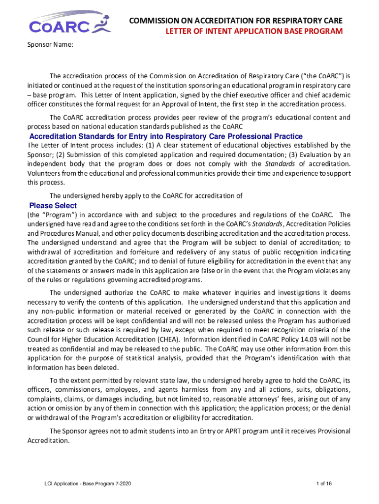 COMMISSION ON ACCREDITATION FOR RESPIRATORY CARE LETTER OF INTENT APPLICATION BASE PROGRAM Sponsor Name:The accreditation process of the Commission on Accreditation of Respiratory Care (the CoARC)