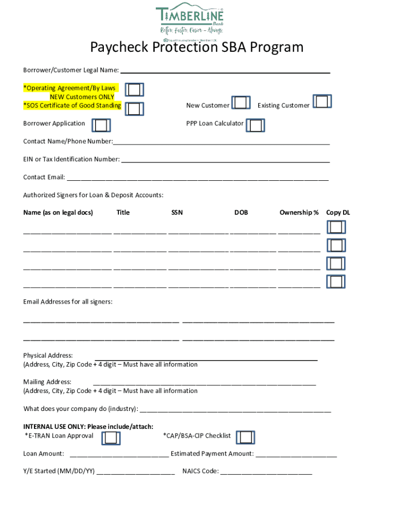 Paycheck Protection SBA Program Borrower/Customer Legal Name: *Operating Agreement/By Laws NEW Customers ONLY *SOS Certificate of Good Standing CustomerBorrower Application PPP Loan CalculatorExisting