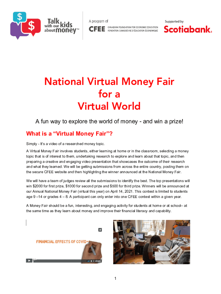Supported binational Virtual Money Fair for a Virtual World A fun way to explore the world of money and win a prize! What is a Virtual Money Fair? Simply It\'s a video of a researched money topic.