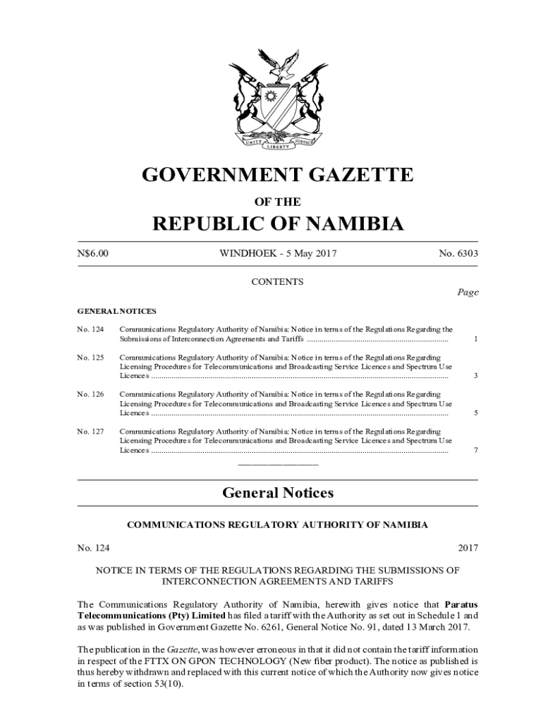 GOVERNMENT GAZETTE OF REPUBLIC OF NAMIBIA N$6.00WINDHOEK 5 May 2017CONTENTSNo. 6303PageGENERAL NOTICES No. 124Communications Regulatory Authority of Namibia: Notice in terms of the Regulations Regarding