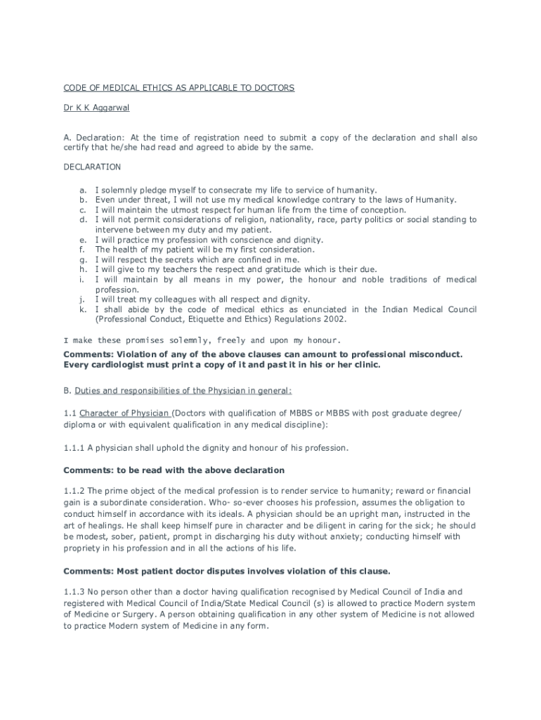 CODE OF MEDICAL ETHICS AS APPLICABLE TO DOCTORS Dr K Aggarwal A. Declaration: At the time of registration need to submit a copy of the declaration and shall also certify that he/she had read and agreed