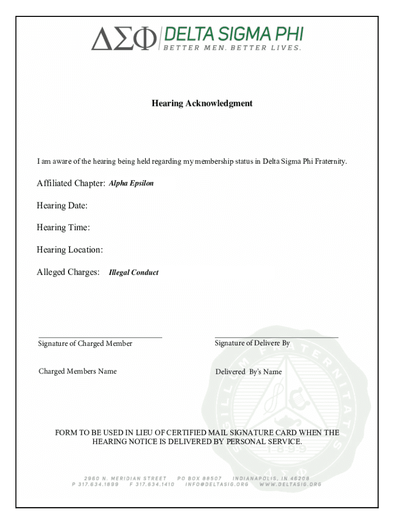 Hearing Acknowledgment am aware of the hearing being held regarding my membership status in Delta Sigma Phi Fraternity. Affiliated Chapter: Alpha Epsilon