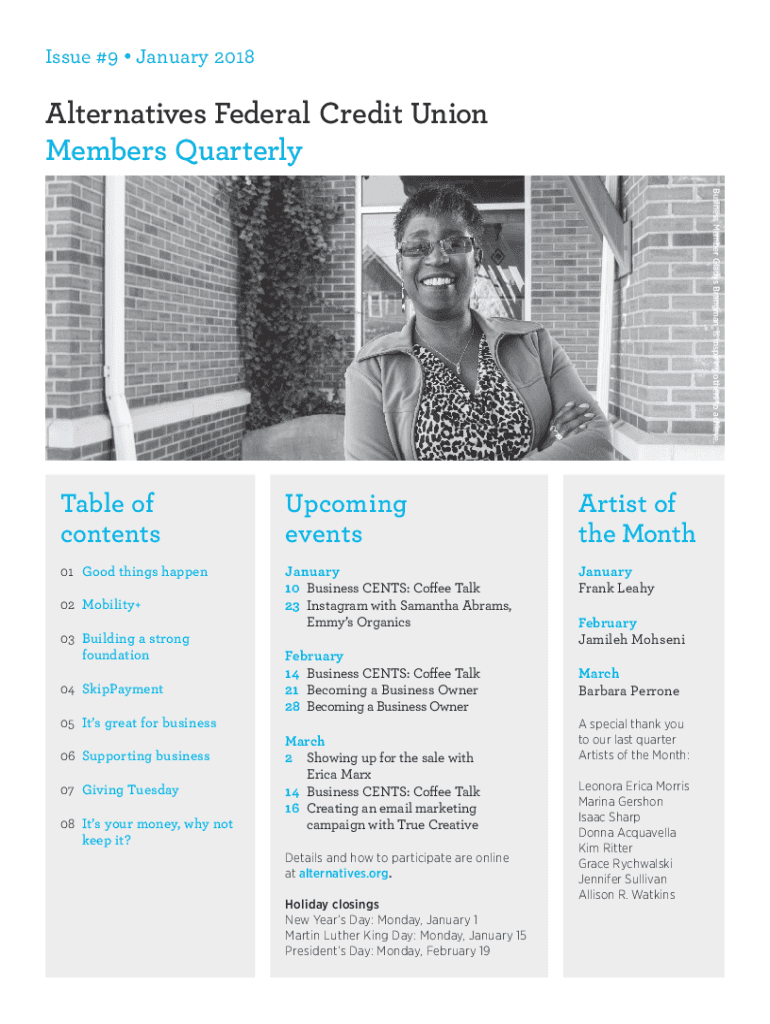 Issue #9 January 2018Alternatives Federal Credit Union Members Quarterly Business Member Gladys Brahman is inspiring others to achieve. Table of contentsUpcoming eventsArtist of the Month01Good things
