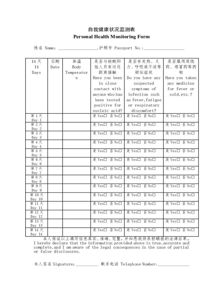 Personal Health Monitoring Form Name___, Passport No.:___ 14 14 Days1 Day 1 2 Day 2 3 Day 3 4 Day 4 5 Day 5 6 Day 6 7 Day 7 8 Day 8 9 Day 9 10 Day 10 11 Day 11 12 Day 12 13 Day 13 14 Day 14 Date Body
