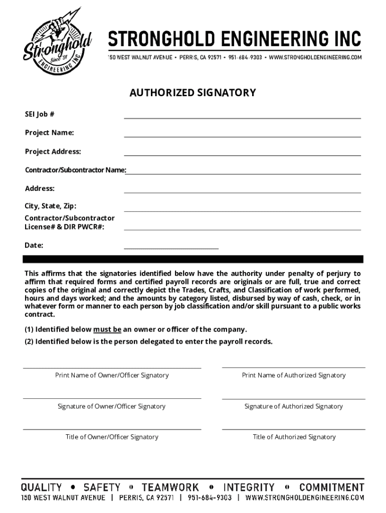 AUTHORIZED SIGNATORY SET Job # Project Name: Project Address: Contractor/Subcontractor Name: Address: City, State, Zip: Contractor/Subcontractor License# & DIR PCR#: Date:This affirms that the signatories
