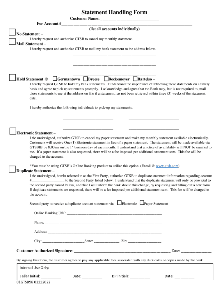 Statement Handling Form Customer Name: ___ For Account #___ (list all accounts individually) No Statement I hereby request and authorize NTSB to cancel my monthly statement. Mail Statement I hereby