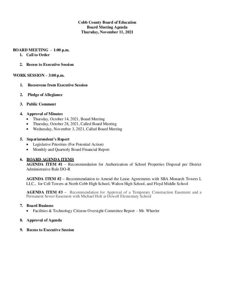 Cobb County Board of Education Board Meeting Agenda Thursday, November 11, 2021BOARD MEETING 1:00 p.m. 1. Call to Order 2. Recess to Executive Session WORK SESSION 3:00 p.m. 1. Reconvene from Executive
