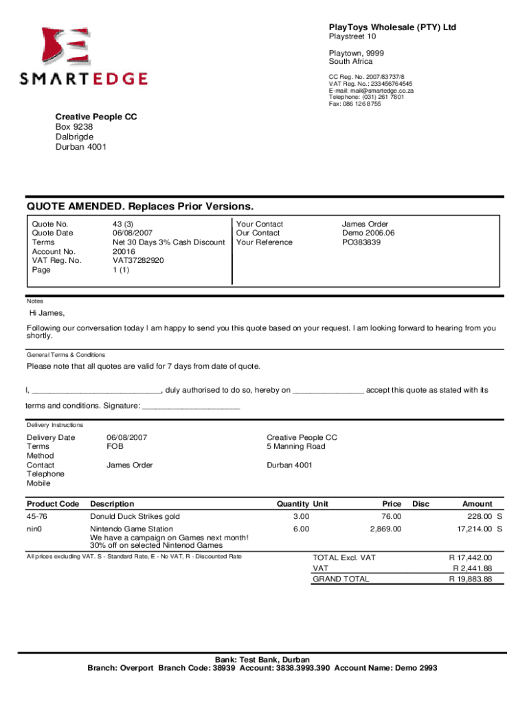 Playboys Wholesale (PTY) Ltd Play street 10 Play town, 9999 South Africa CC Reg. No. 2007/83737/8 VAT Reg. No.: 233456764545 Email: mail@smartedge.co.za Telephone: (031) 261 7801 Fax: 086 126 8755Creative