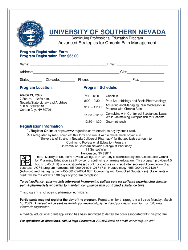 UNIVERSITY OF SOUTHERN NEVADA Continuing Professional Education ProgramAdvanced Strategies for Chronic Pain Management Program Registration Form Program Registration Fee: $65.00 Name: ___ Email: ___Address: