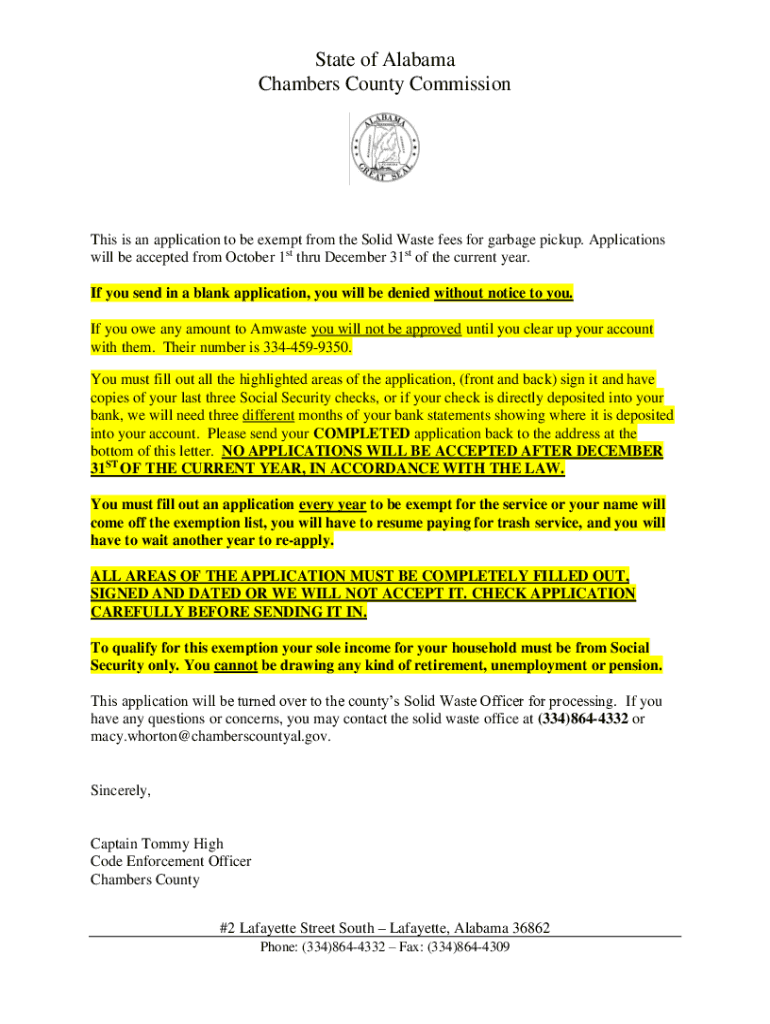 State of Alabama Chambers County Commissions is an application to be exempt from the Solid Waste fees for garbage pickup. Applications will be accepted from October 1st through December 31st of the