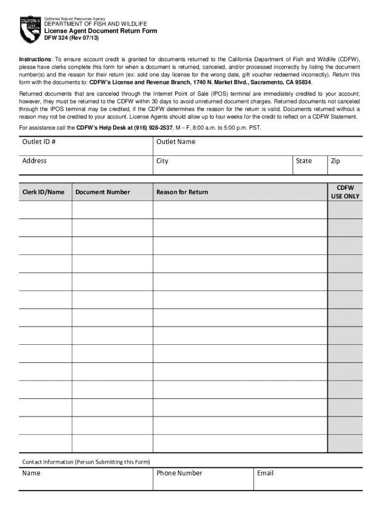 California Natural Resources AgencyPRINTDEPARTMENT OF FISH AND WILDLIFELicense Agent Document Return Form