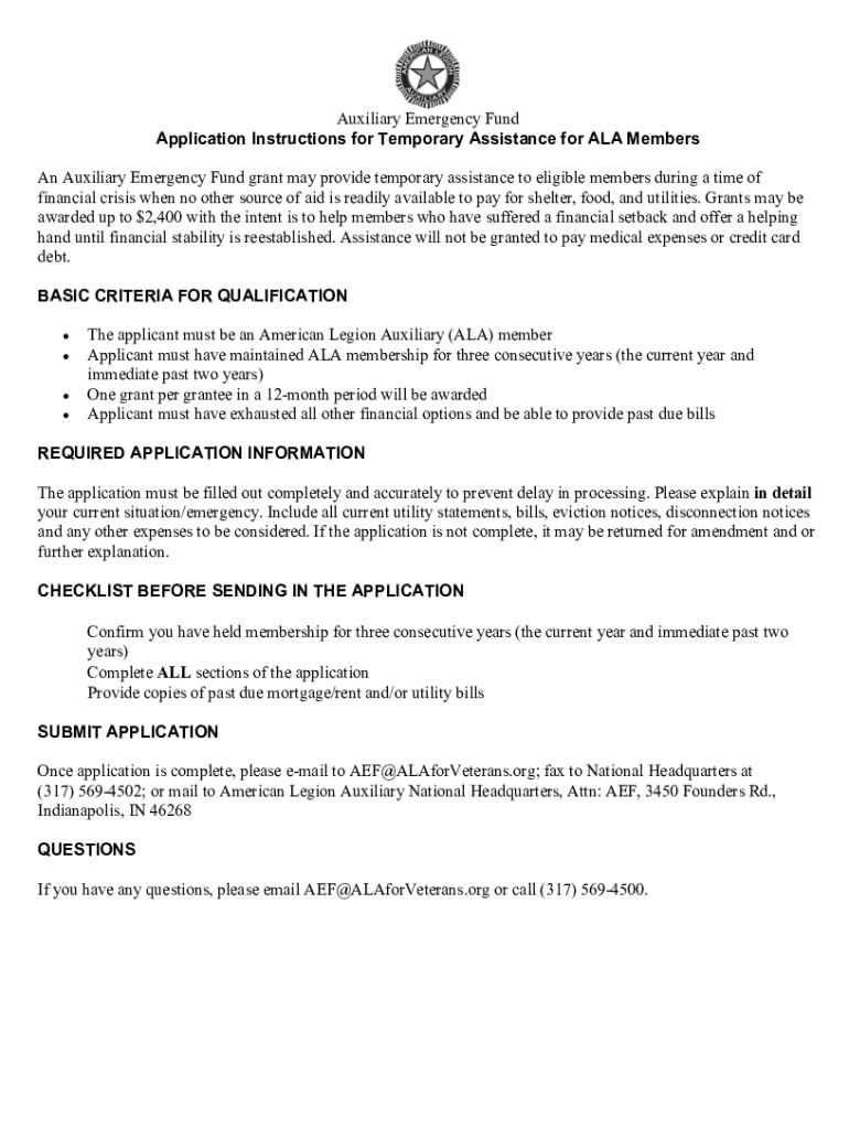 Auxiliary Emergency Fund Application Instructions for Temporary Assistance for ALA Members An Auxiliary Emergency Fund grant may provide temporary assistance to eligible members during a time of financial