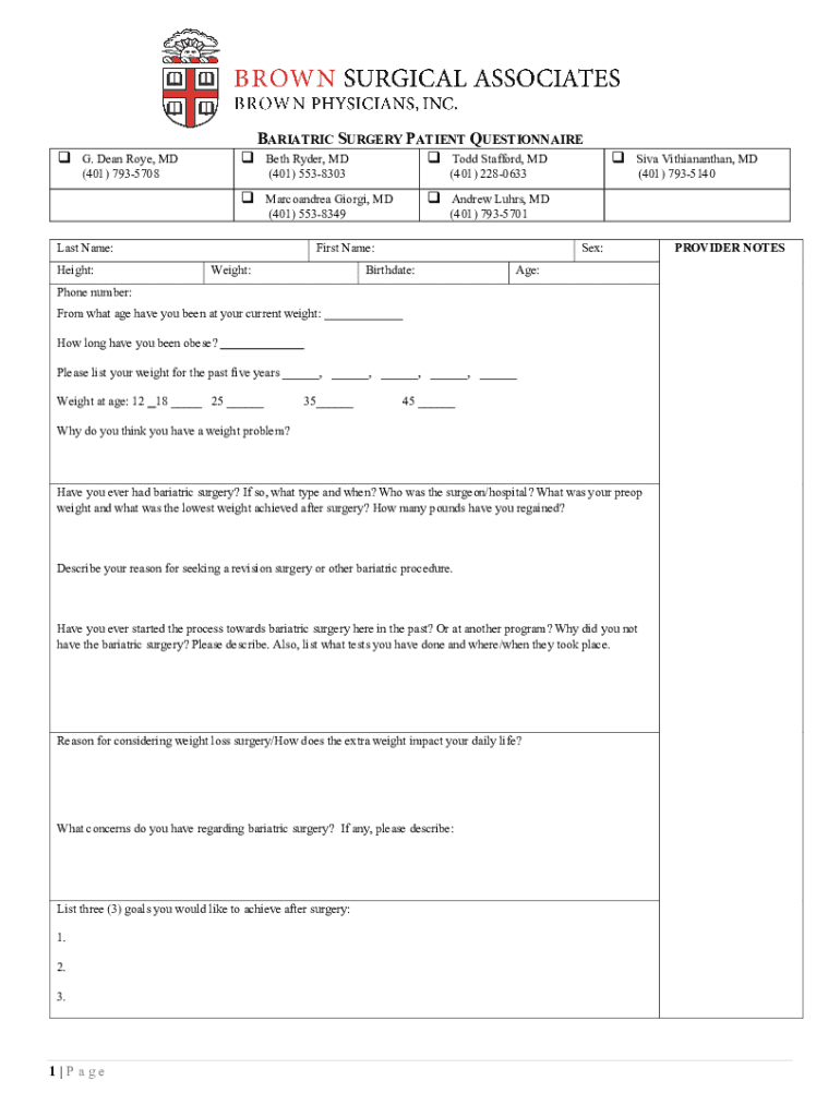 BARIATRIC SURGERY PATIENT QUESTIONNAIRE G. Dean Role, MD Beth Ryder, MD(401) 7935708 Todd Stafford, MD(401) 5538303 Marcoandrea Giorgi, Height:(401) 7935701First Name: Weight:(401) 7935140 Andrew