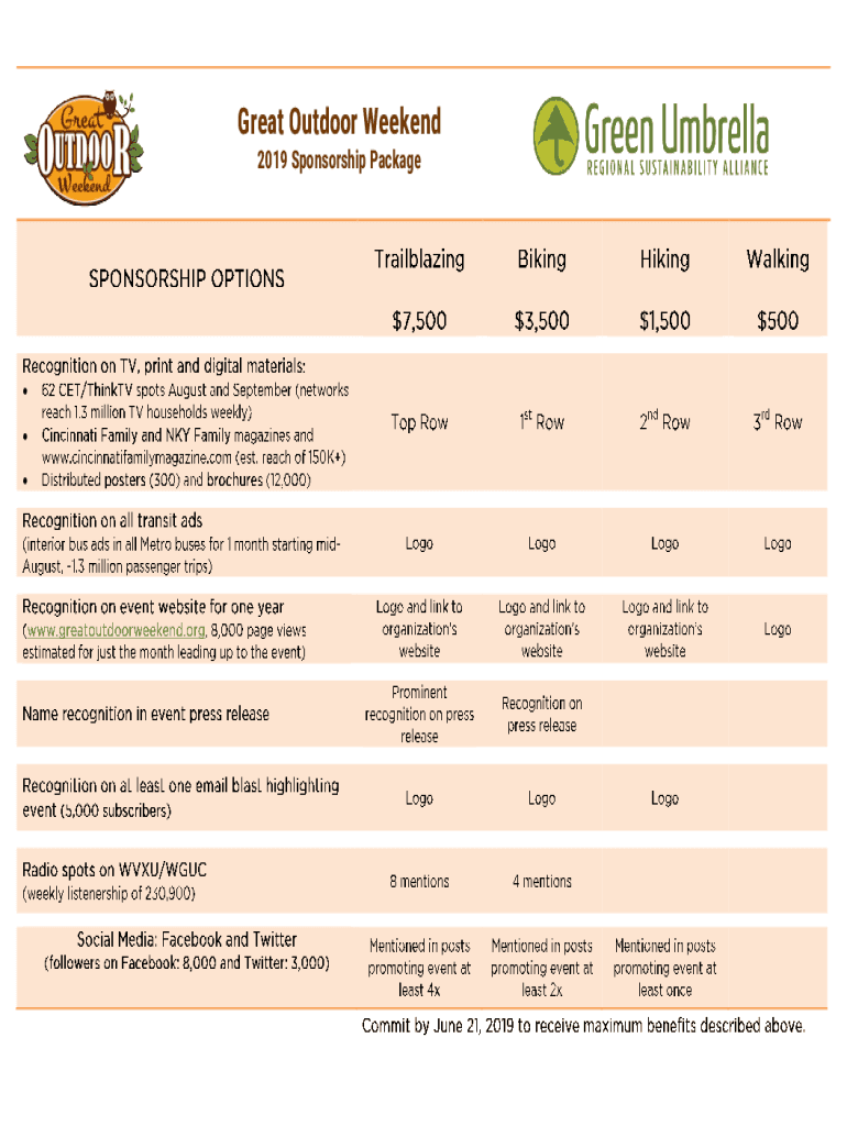 Great Outdoor Weekend 2019 Sponsorship Package Register as a sponsor online or by completing this form. Sponsorship Registrations, I want to sponsor the Great Outdoor Weekend at the following level: