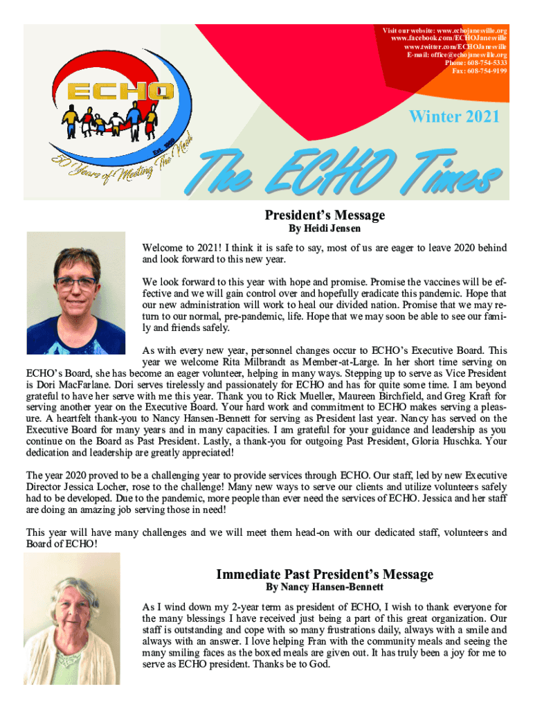 Visit our website: www.echojanesville.orgwww.facebook.com/ECHOJanesville www.twitter.com/ECHOJanesville Email: office@echojanesville.org Phone: 6087545333 Fax: 6087549199Winter 2021Presidents Message