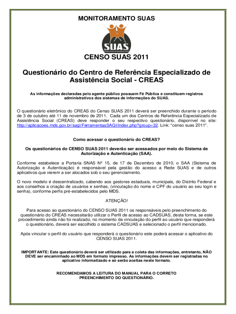 MONITORAMENTO SUSPENSE SEAS 2011 Question do CENTR de Referncia Specialized DE Assistance Social AREAS As informed declared polo agent public possum F Public e constitute registers administration
