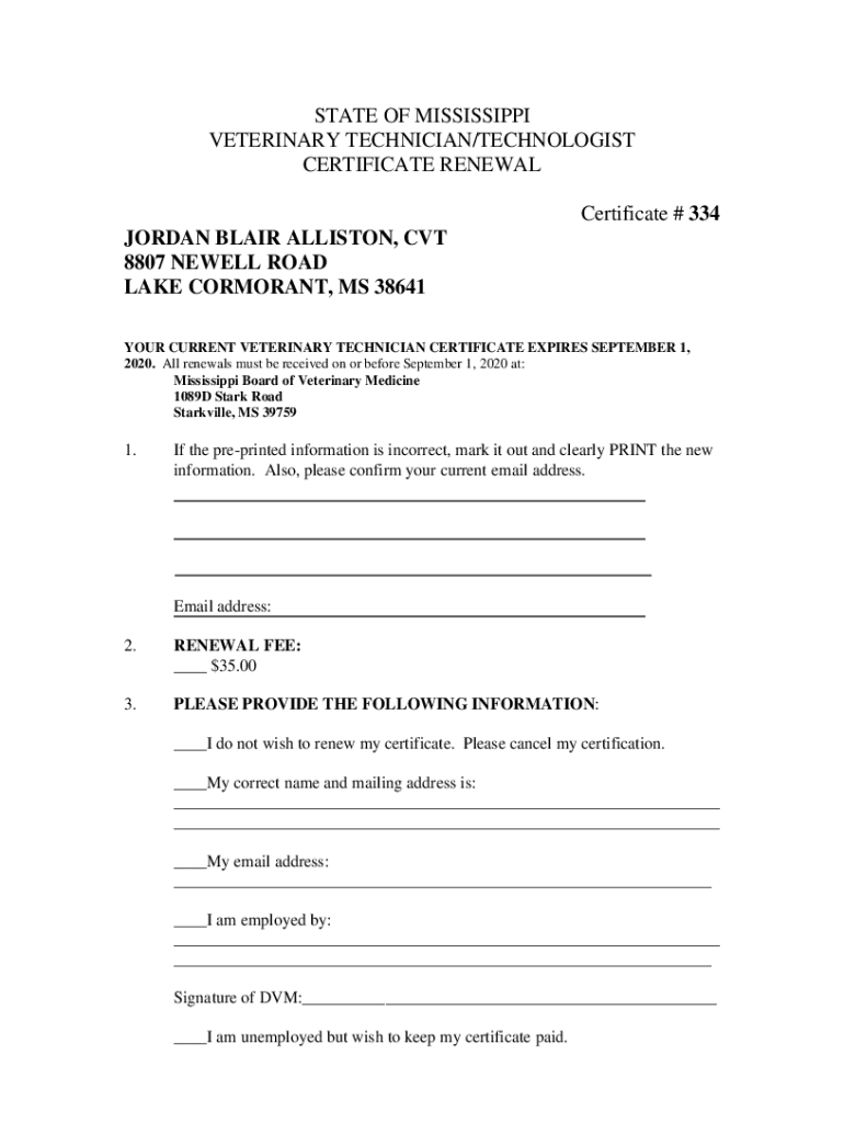STATE OF MISSISSIPPI VETERINARY TECHNICIAN/TECHNOLOGIST CERTIFICATE RENEWAL Certificate # 334 JORDAN BLAIR ALLISON, CVT 8807 NEWELL ROAD LAKE CORMORANT, MS 38641 YOUR CURRENT VETERINARY TECHNICIAN