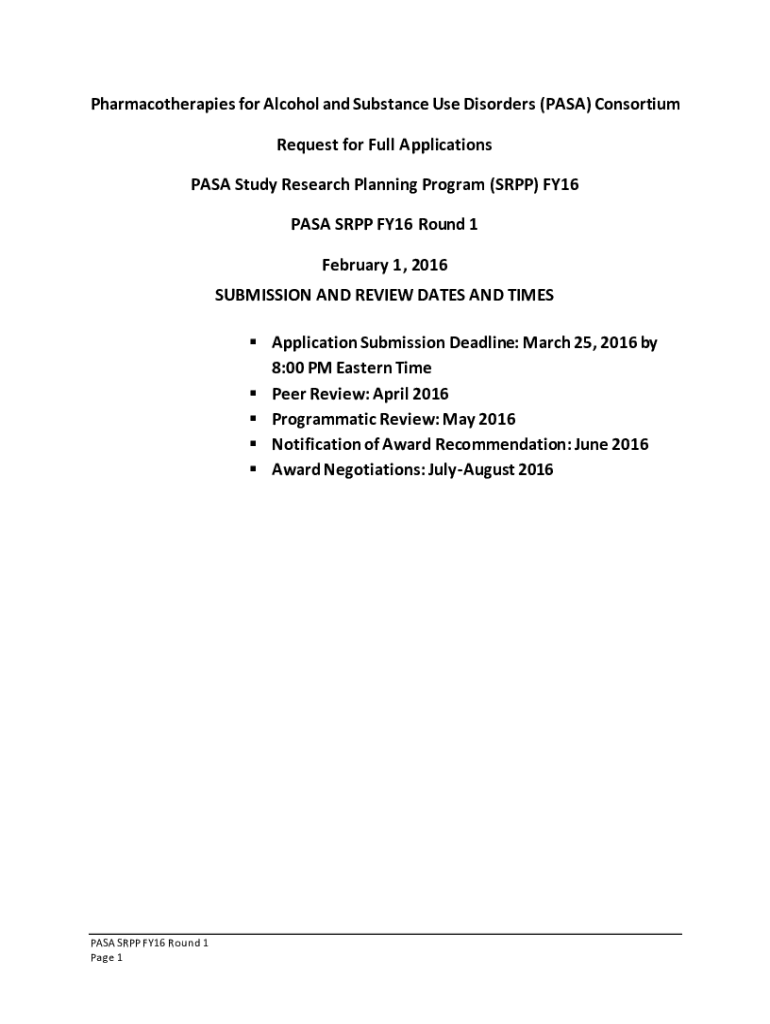 Pharmacotherapy for Alcohol and Substance Use Disorders (PASS) Consortium Request for Full Applications PASS Study Research Planning Program (SUPP) FY16 PASS SUPP FY16 Round 1 February 1, 2016, SUBMISSION