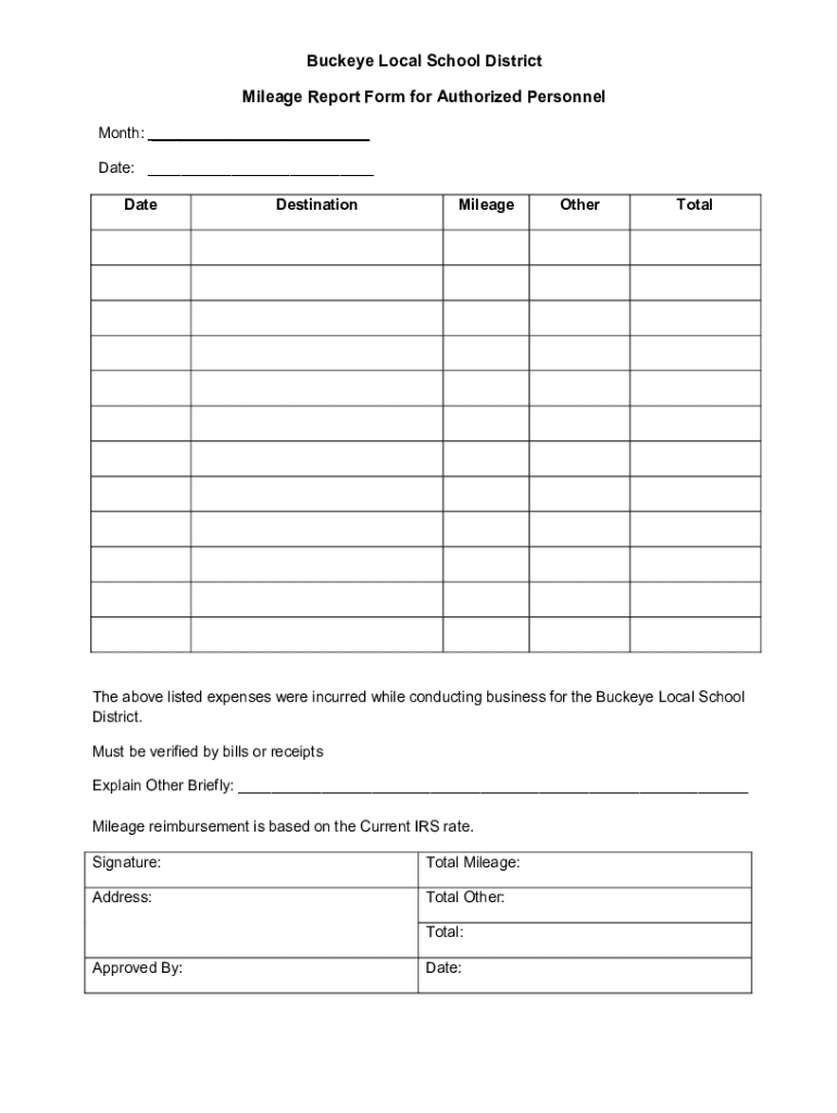 Buckeye Local School District Mileage Report Form for Authorized Personnel Month: ___ Date: ___ DateDestinationMileageOtherTotalThe above listed expenses were incurred while conducting business for