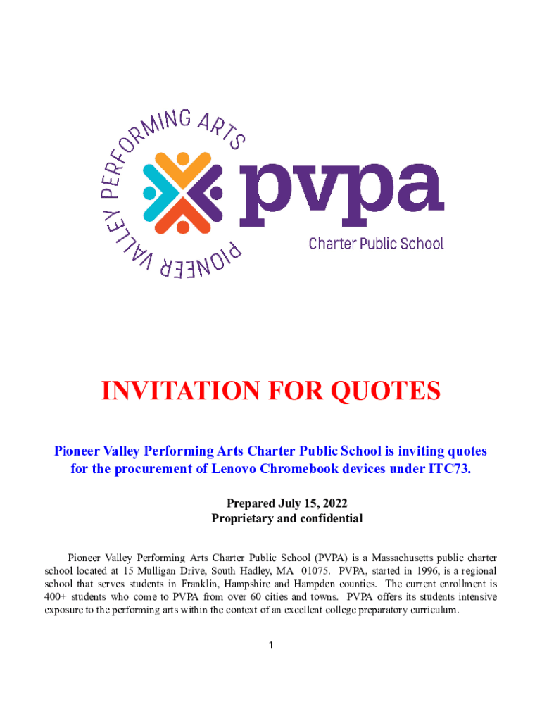 INVITATION FOR QUOTES Pioneer Valley Performing Arts Charter Public School is inviting quotes for the procurement of Lenovo Chromebook devices under ITC73. Prepared July 15, 2022, Proprietary and