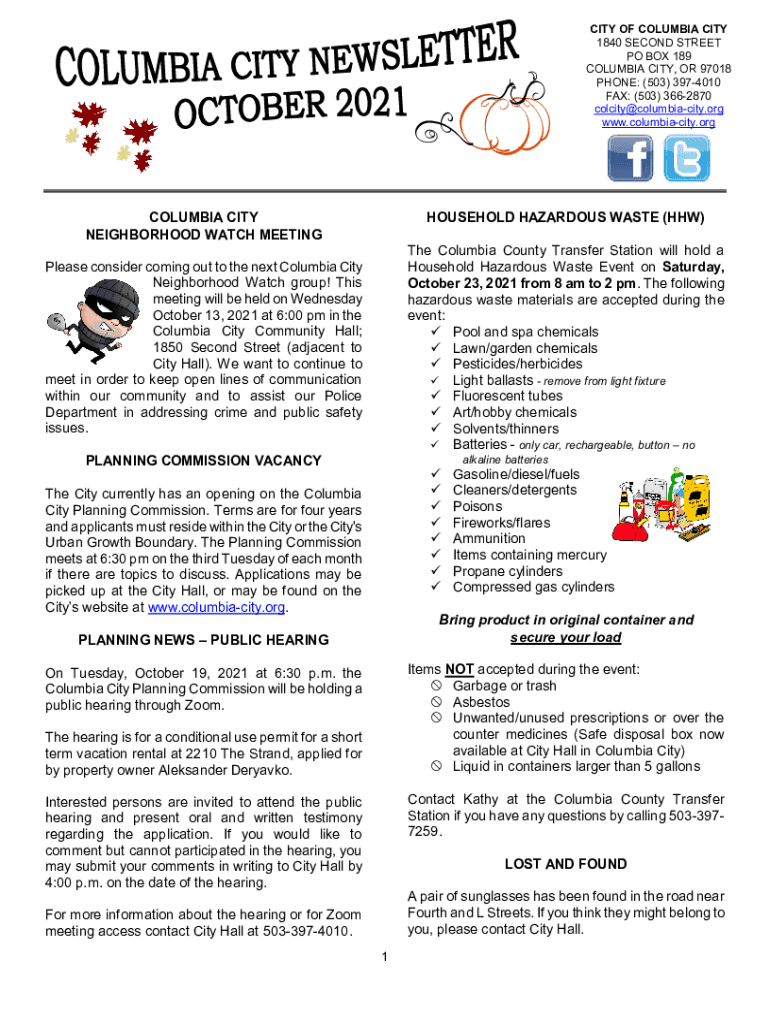 CITY OF COLUMBIA CITY 1840 SECOND STREET PO BOX 189 COLUMBIA CITY, OR 97018 PHONE: (503) 3974010 FAX: (503) 3662870 colcity@columbiacity.org www.columbiacity.orgCOLUMBIA CITY NEIGHBORHOOD WATCH MEETINGHOUSEHOLD