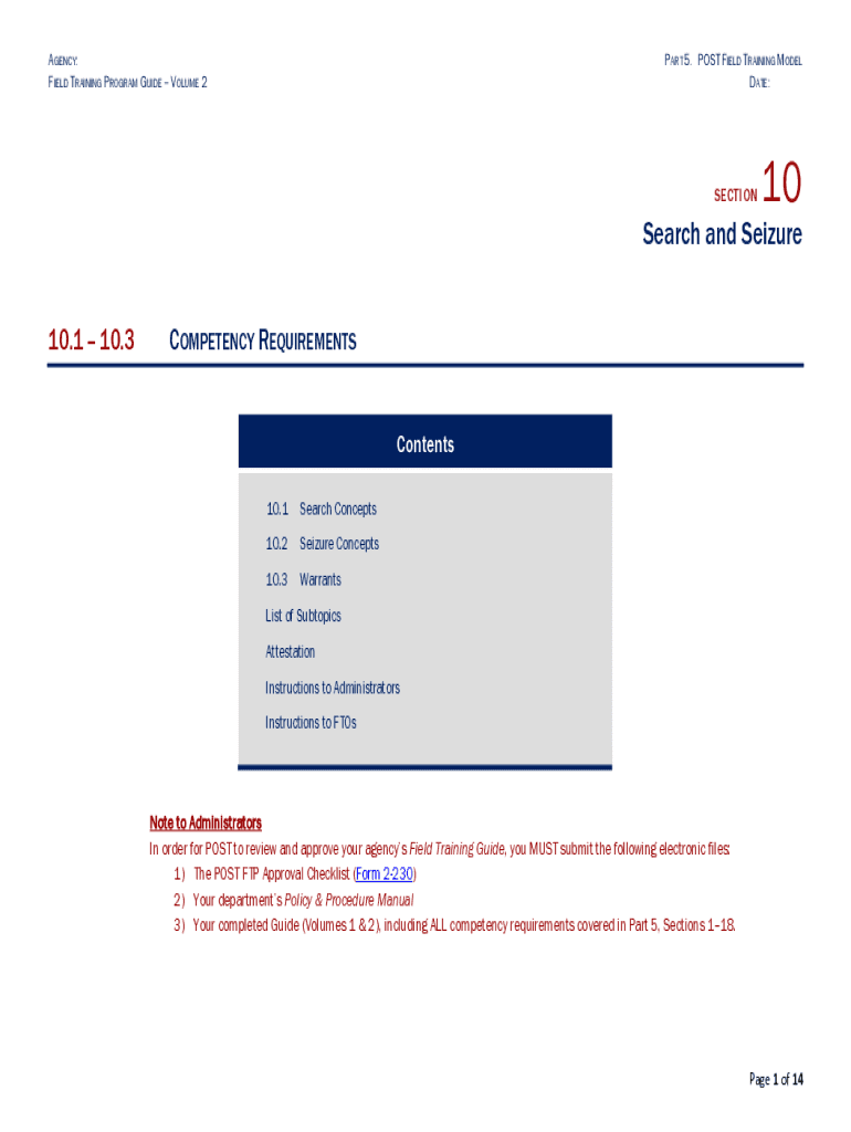 AGENCY: FIELD TRAINING PROGRAM GUIDE VOLUME 2PART 5. POST FIELD TRAINING MODEL DATE:SECTION10Search and Seizure 10.1 10.3COMPETENCY REQUIREMENTS Contents 10.1Search Concepts10.2Seizure Concepts10.3WarrantsList