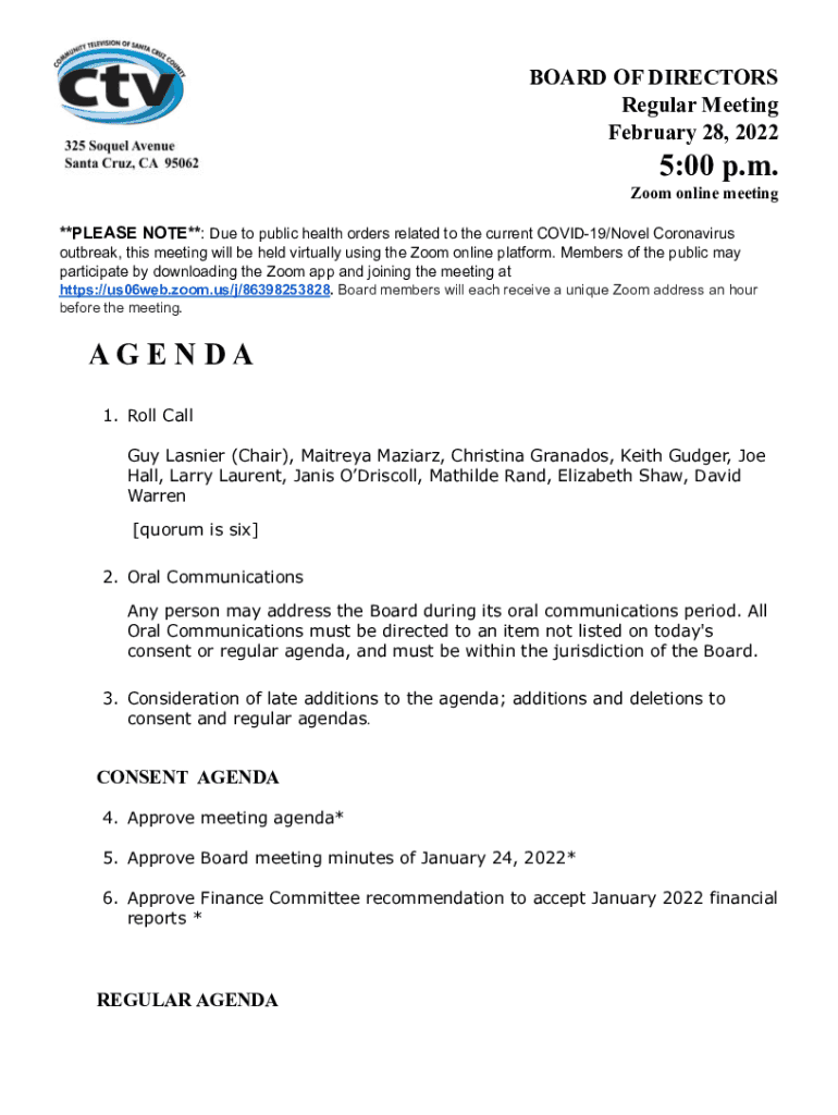 BOARD OF DIRECTORS Regular Meeting February 28, 20225:00 p.m. Zoom online meeting **PLEASE NOTE**: Due to public health orders related to the current COVID-19/Novel Coronavirus outbreak, this meeting