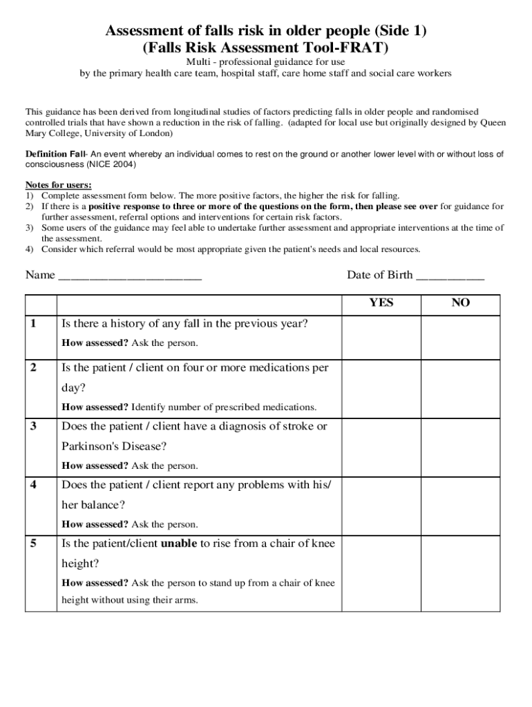 Assessment of falls risk in older people (Side 1) (Falls Risk Assessment Tolerant) Multi professional guidance for use by the primary health care team, hospital staff, care home staff and social care