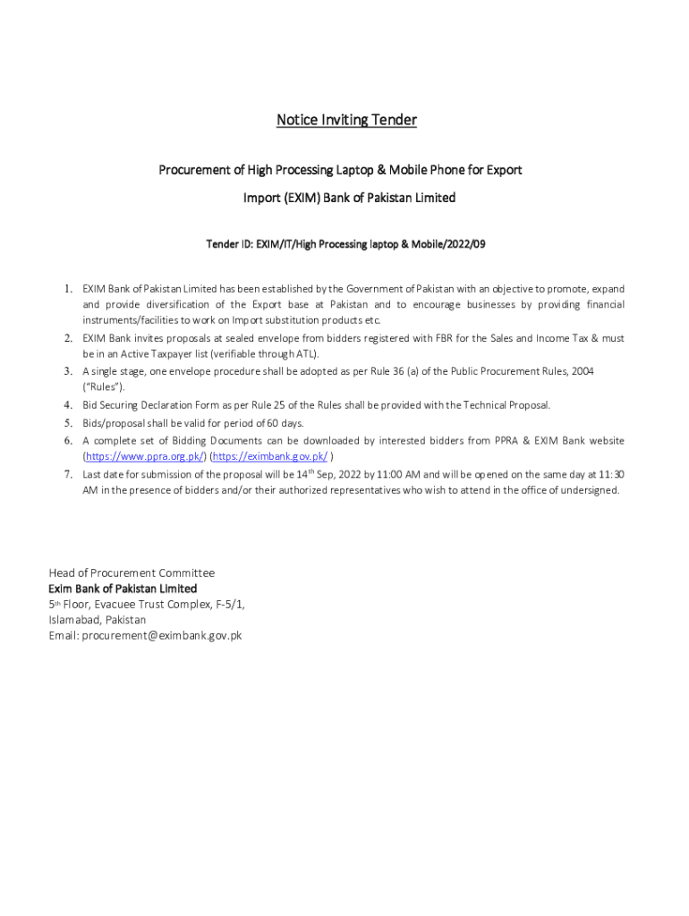Notice Inviting Tender Procurement of High Processing Laptop & Mobile Phone for Export Import (EXIT) Bank of Pakistan Limited Tender ID: EXIT/IT/High Processing laptop & Mobile/2022/091. EXIT Bank