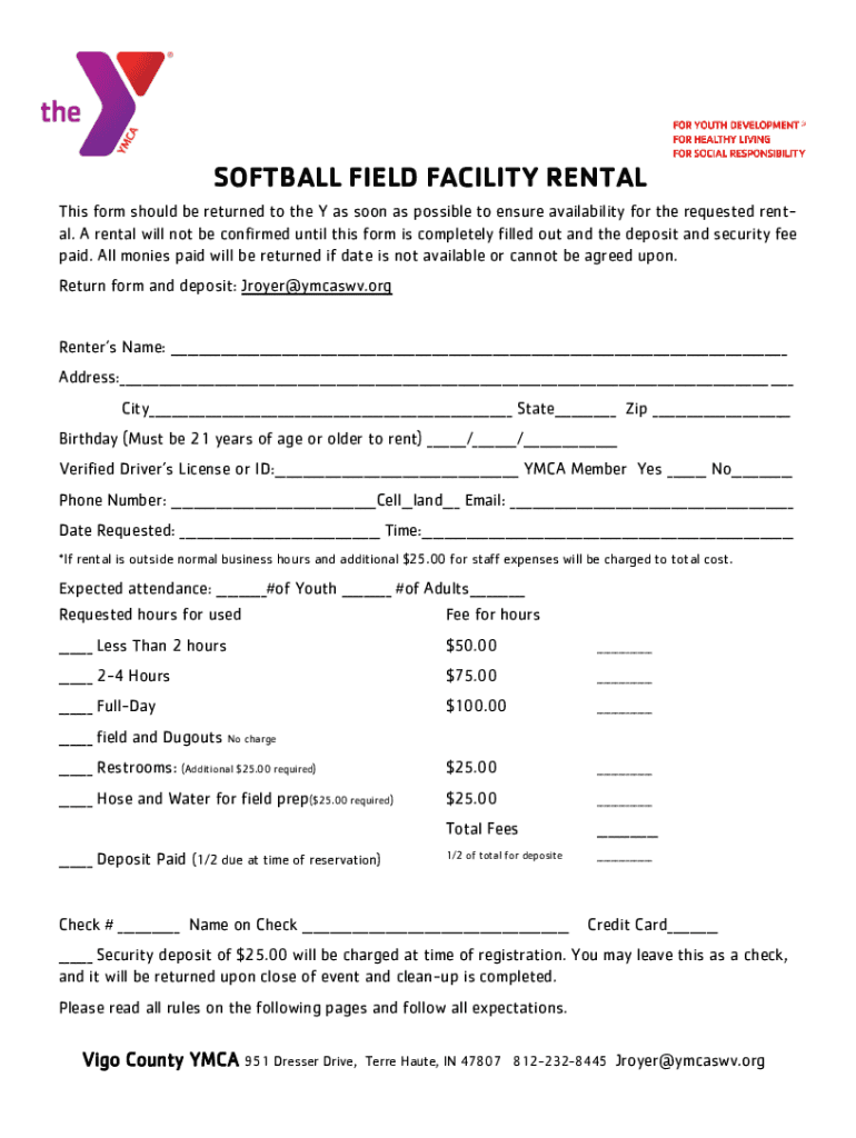 SOFTBALL FIELD FACILITY RENTAL This form should be returned to the Y as soon as possible to ensure availability for the requested rental. A rental will not be confirmed until this form is completely
