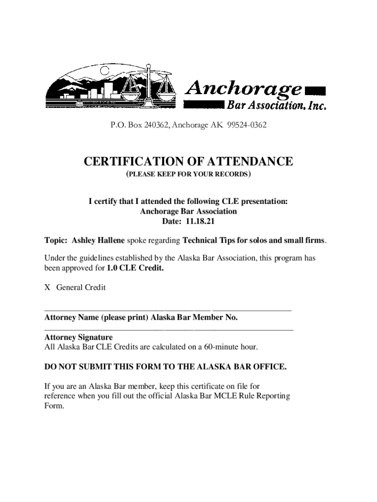 P.O. Box 240362, Anchorage AK 995240362CERTIFICATION OF ATTENDANCE (PLEASE KEEP FOR YOUR RECORDS) I certify that I attended the following CLE presentation: Anchorage Bar Association Date: 11.18.21