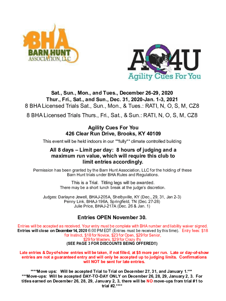 Sat., Sun., Mon., and Tues., December 2629, 2020 Thur., Fri., Sat., and Sun., Dec. 31, 2020Jan. 13, 20218 BHA Licensed Trials Sat., Sun., Mon., & Tues.: RATE, N, O, S, M, CZ8 8 BHA Licensed Trials