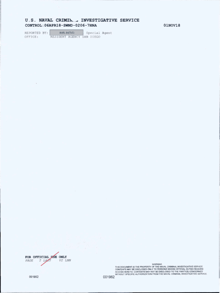 U. S. NAVAL Crisis. . INVESTIGATIVE SERVICE CONTROL : 06APR18SWND 02067 HNA01NOV18(b)(6), (b)(7)(C) REPORTED BY: S coal A OFFICE: RESIDE T AG ENCY SAN DI GOFER OFF COAL USONLYPAGE:V2 L NN2 Last ING