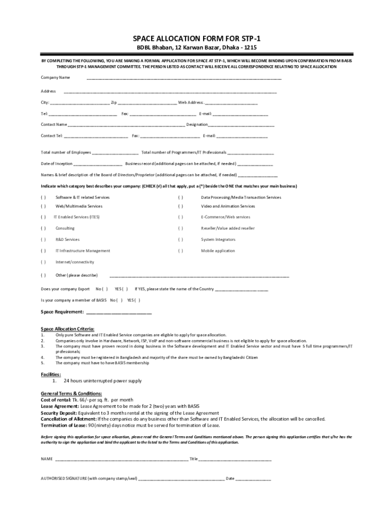 SPACE ALLOCATION FORM FOR STP1 BBL Shaman, 12 Kármán Bazaar, Dhaka 1215 BY COMPLETING THE FOLLOWING, YOU ARE MAKING A FORMAL APPLICATION FOR SPACE AT STP1, WHICH WILL BECOME BINDING UPON CONFIRMATION