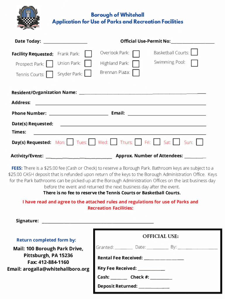 Borough of Whitehall Application for Use of Parks and Recreation FacilitiesOfficial Permit No: Date Today'd Prospect Park: D Union Park: D Tennis Courts: D Snyder Park: Facility Requested: Frank Park:Overlook