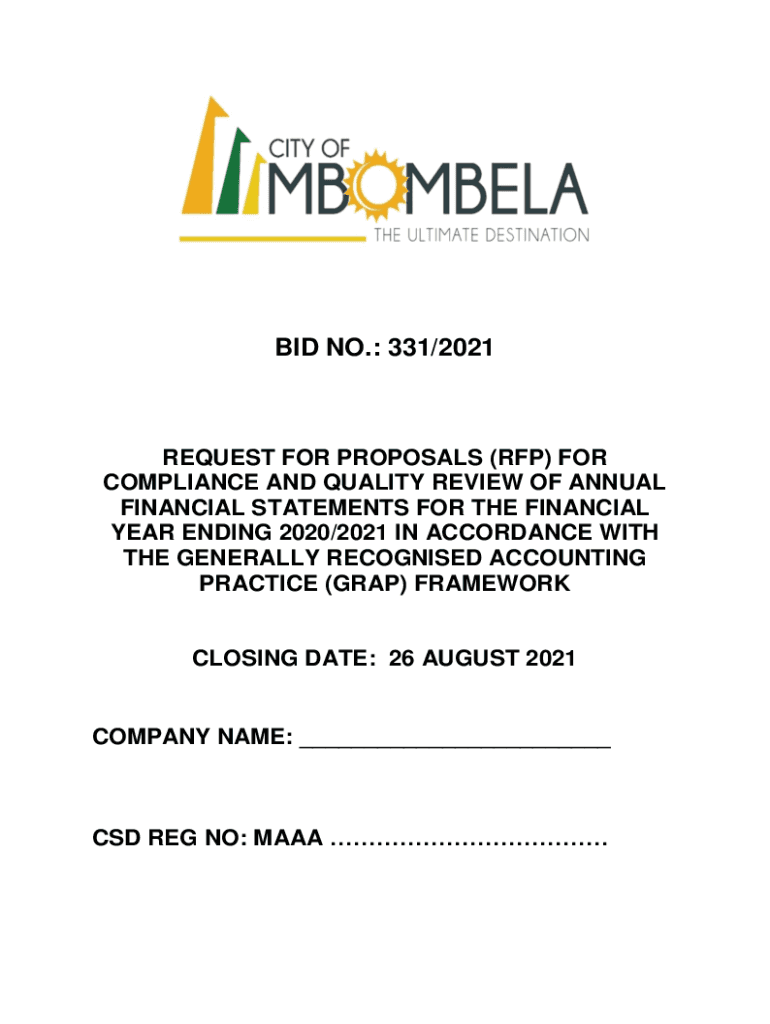 BID NO.: 331/2021REQUEST FOR PROPOSALS (RFP) FOR COMPLIANCE AND QUALITY REVIEW OF ANNUAL FINANCIAL STATEMENTS FOR THE FINANCIAL YEAR ENDING 2020/2021 IN ACCORDANCE WITH THE GENERALLY Recognized ACCOUNTING