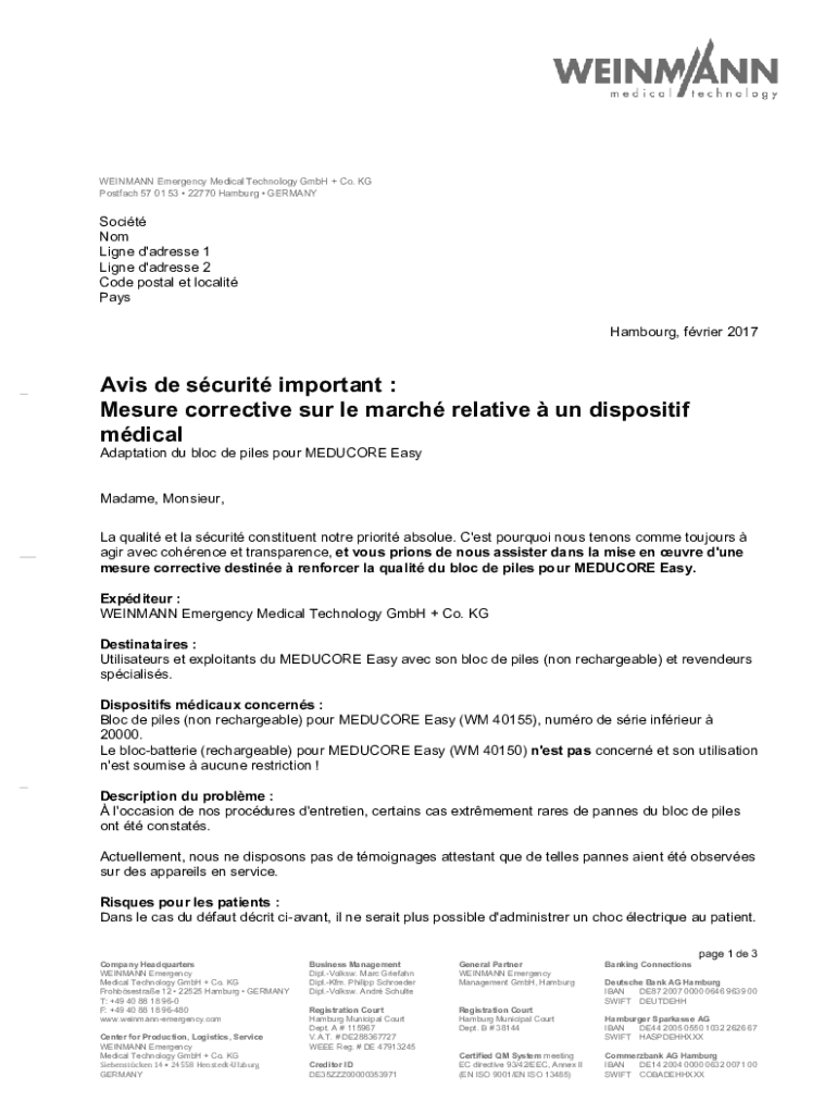 WEIZMANN Emergency Medical Technology GmbH + Co. KG Postal 57 01 53 22770 Hamburg GERMANYSocit Not Line d\'address 1 Line d\'address 2 Code postal ET locality Pays Hamburg, frier 2017Avis de security