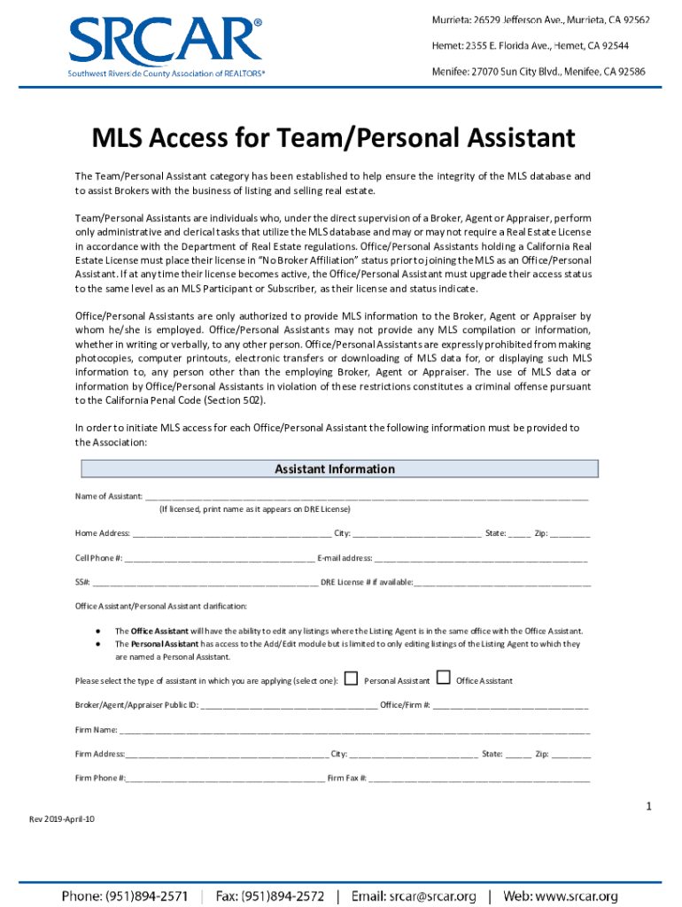 MLS Access for Team/Personal Assistant The Team/Personal Assistant category has been established to help ensure the integrity of the MLS database and to assist Brokers with the business of listing