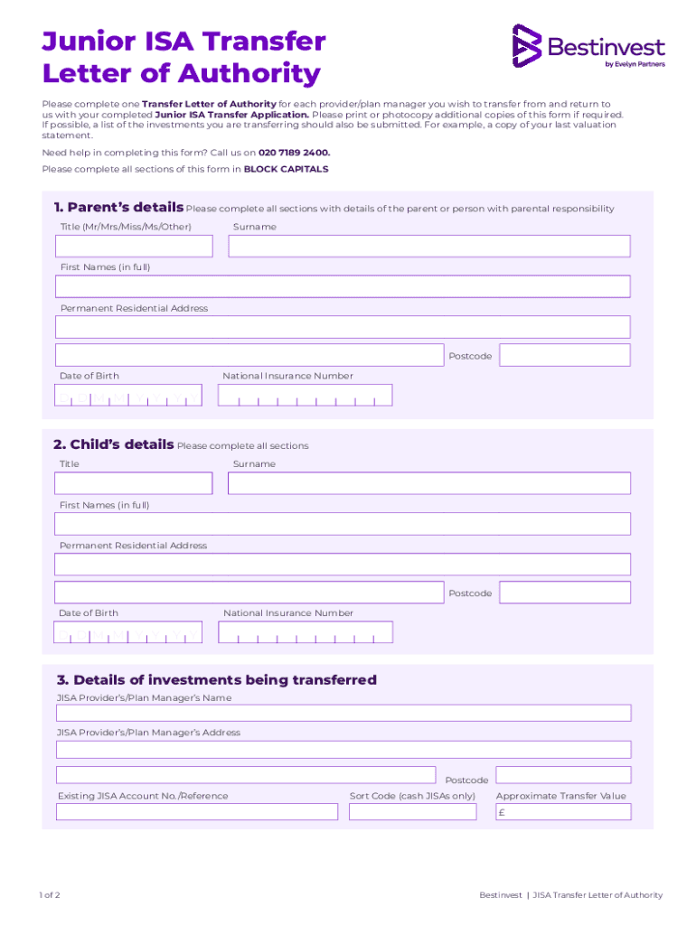 Junior ISA Transfer Letter of Authority Please complete one Transfer Letter of Authority for each provider/plan manager you wish to transfer from and return to us with your completed Junior ISA Transfer