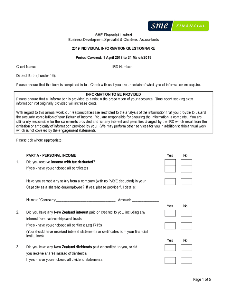SME Financial Limited Business Development Specialist & Chartered Accountants 2019 INDIVIDUAL INFORMATION QUESTIONNAIRE Period Covered: 1 April 2018 to 31 March 2019 Client Name:IRD Number:Date of