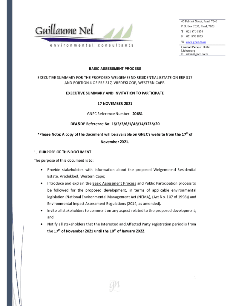 45 Fabric Street, Pearl, 7646 P.O. Box 2632, Pearl, 7620 T 021 870 1874 F021 870 1873W www.gnec.co.za Contact Person: Hettie Heisenberg E intern@gnec.co.zaBASIC ASSESSMENT PROCESSEXECUTIVE SUMMARY
