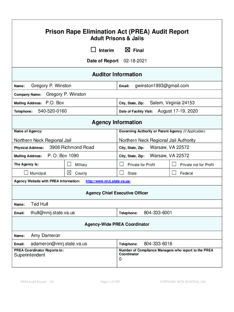Prison Rape Elimination Act (AREA) Audit Report Adult Prisons & JailsInterimDate of ReportFinal02182021Auditor Information Name:Gregory P. WinstonEmail:Company Name:Gregory P. WinstonMailing Address:P.O.